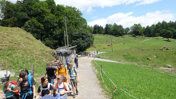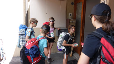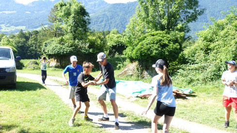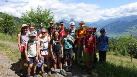Gut gelaunt und mit wärmender Morgensonne, starteten wir den Tag mit einem leckeren Frühstück. Den Morgen verbrachten unsere "Dörfler" in ihren Familien und stockten ihr gemeinsames Konto mit einem Geländespiel auf. Beim verstecken ihrer Fahnen im Wald mussten unsere Dorfbewohner strategisches Geschick zeigen und beim anschliessenden Spiel vollen Einsatz geben. So viel Einsatz kostet viel Energie, doch zum Glück verwöhnte unsere super Küche uns wieder einmal mit einer feinen Mahlzeit. Nach dem Verdauen und dem erledigen aller Ämtlis tauschten wir unsere Kleider mit Badesachen und machten uns auf den Weg zu unserem Badeort. Wir gönnten uns ein Schwumm und kühlten uns am angenehmen Zugersee-Wasser ab. Beim Lagerplatz wieder angekommen, eilte uns der Präsident entgegen um uns seine gute Kunde mitzuteilen. Wir konnten mit unserem Ersparten einen Deal abschliessen, um uns eine Lokomotive und Anschluss an das Schienennetz zu leisten. In verschiedenen Posten lernten wir, wie man mit diversen Material Lagerbauten baut und legten die Schienen für unseren Zug. Ein kleiner Bahnhof, der stolz unser Dorfnamen trägt, schliesst unser Dorf an die anderen Gleise und somit an die Aussenwelt an. Am frühen Abend spielten wir noch ein Geländespiel auf dem gesamten Platz. Zum Schluss des Tages beendeten wir den Tag mit einem grossen Zahnputz-Kreis.